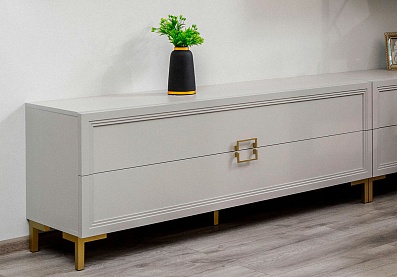 Обивка стильного оттенка «серый кашемир» выполнена из практичного и износостойкого микровелюра. Высокое изголовье простегано декоративной строчкой, украшено по периметру золотой окантовкой. Каркас изделия изготовлен из ламинированной ДСП. Мягкая отделка сводит риск травматизации в ночной атмосфере спальни к минимуму. Упругие ламели ложа обладают ортопедическим эффектом. Металлические ножки-опоры окрашены порошковой краской в серый цвет.