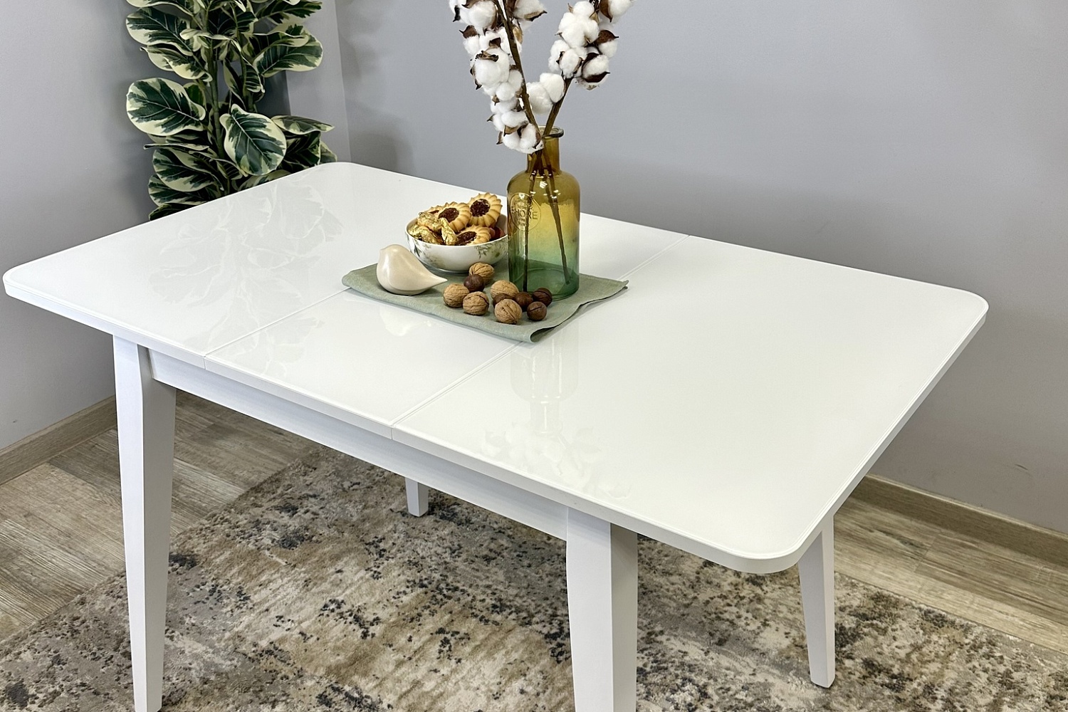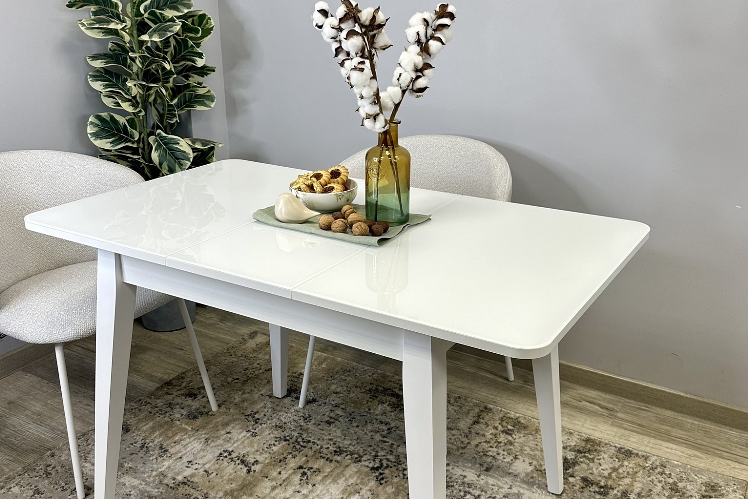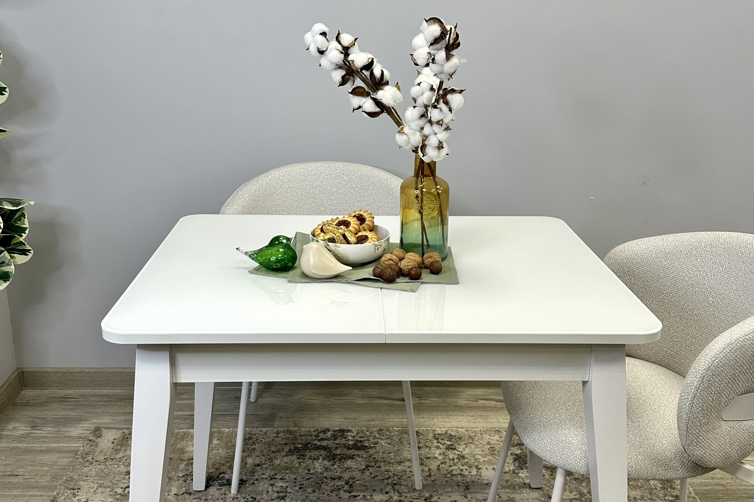 Стол обеденный Орпен квадратный раздвижной 900М опоры белые, столешница - стекло белое глянец.