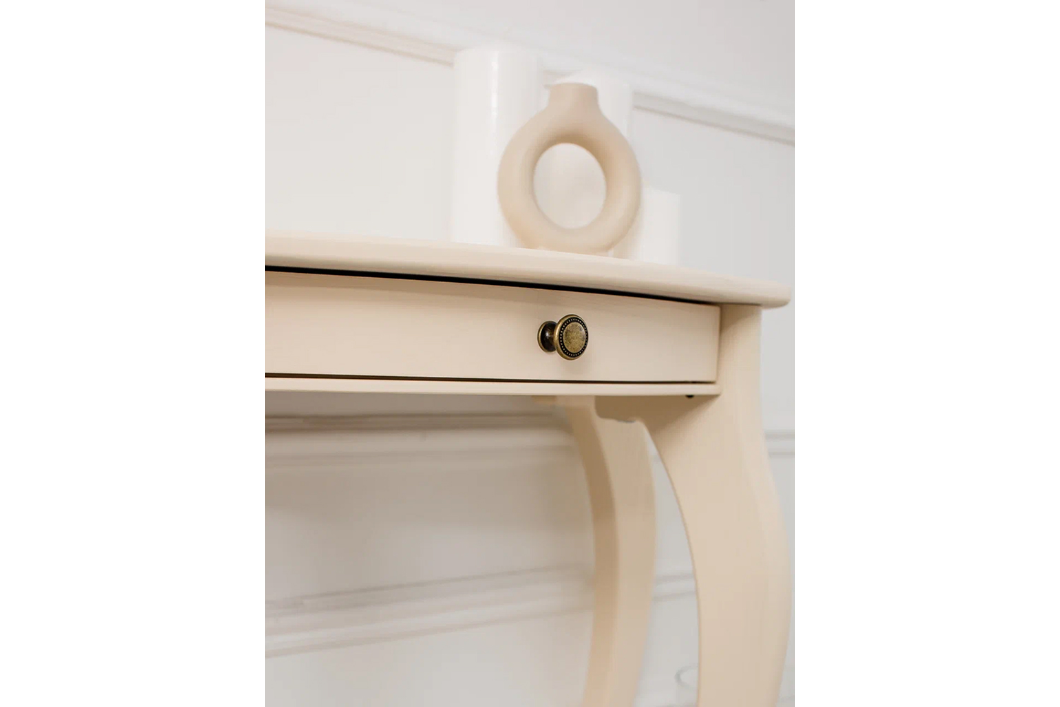 Столешница полукруглой формы выполнена из прочного, износостойкого МДФ, основание — из натуральной древесины. Лакированное глянцевое покрытие смотрится изысканно и благородно, фигурные ножки подчеркивают элегантность изделия. Широкий выдвижной ящик снабжен точечной круглой ручкой, декорированной «под золото».