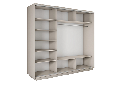 • Внутреннее пространство разделено на 3 части — две части объединены в одну, содержат штангу и по 2 ниши сверху и снизу. Третья часть укомплектована пятью полками;